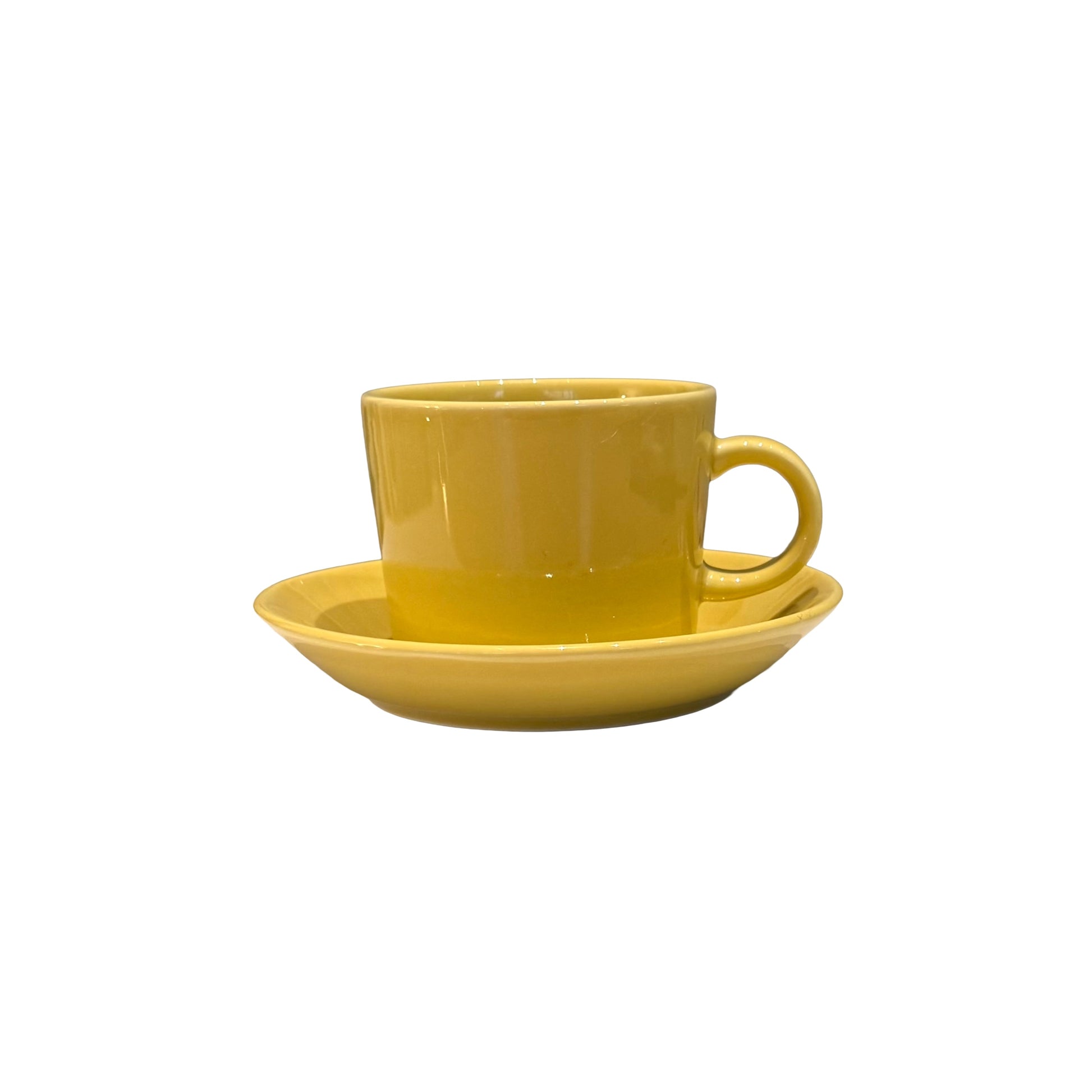 Kahvikuppi ja aluslautanen Teema-sarjaa. Valmistaja Arabia, Suomi. Teema-sarja pohjautuu Kaj Franckin Kilta-sarjan muotoiluun vuodelta 1949.