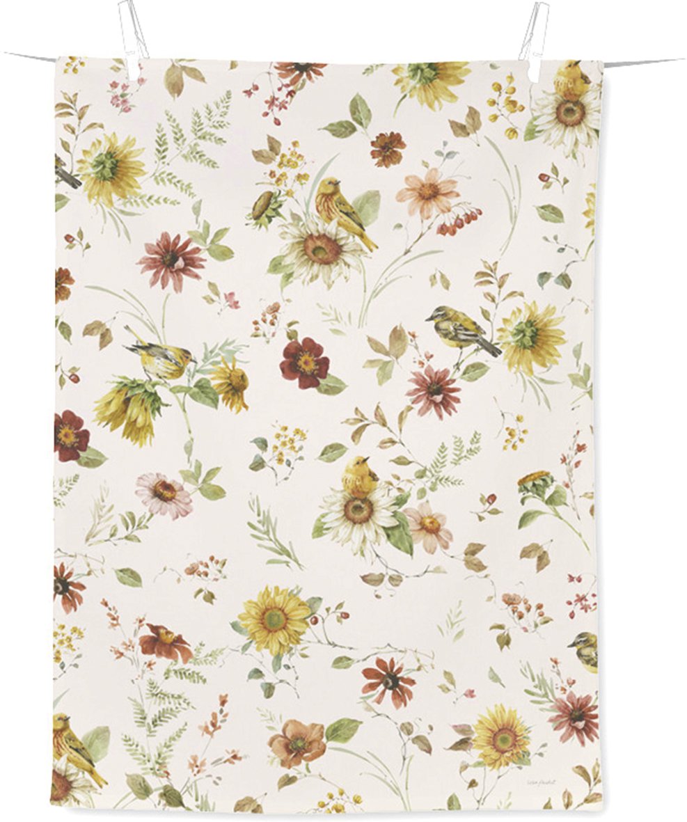 Keittiöpyyhe kauniilla kuosilla, jossa kukkia ja lintuja. Pohjaväri cream. Materiaali: 100% puuvilla. Koko: 50x70cm.