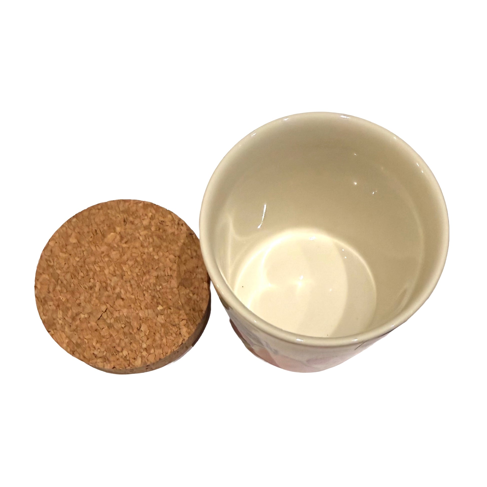 Purkki Kimara korkkikannella. Valmistaja: Arabia, Suomi. Koko: korkeus 8.5cm, halkaisija 8cm. Design: Pattern Bakery. Vuoden 2014 sesonkituote. Kunto: uutta vastaava.