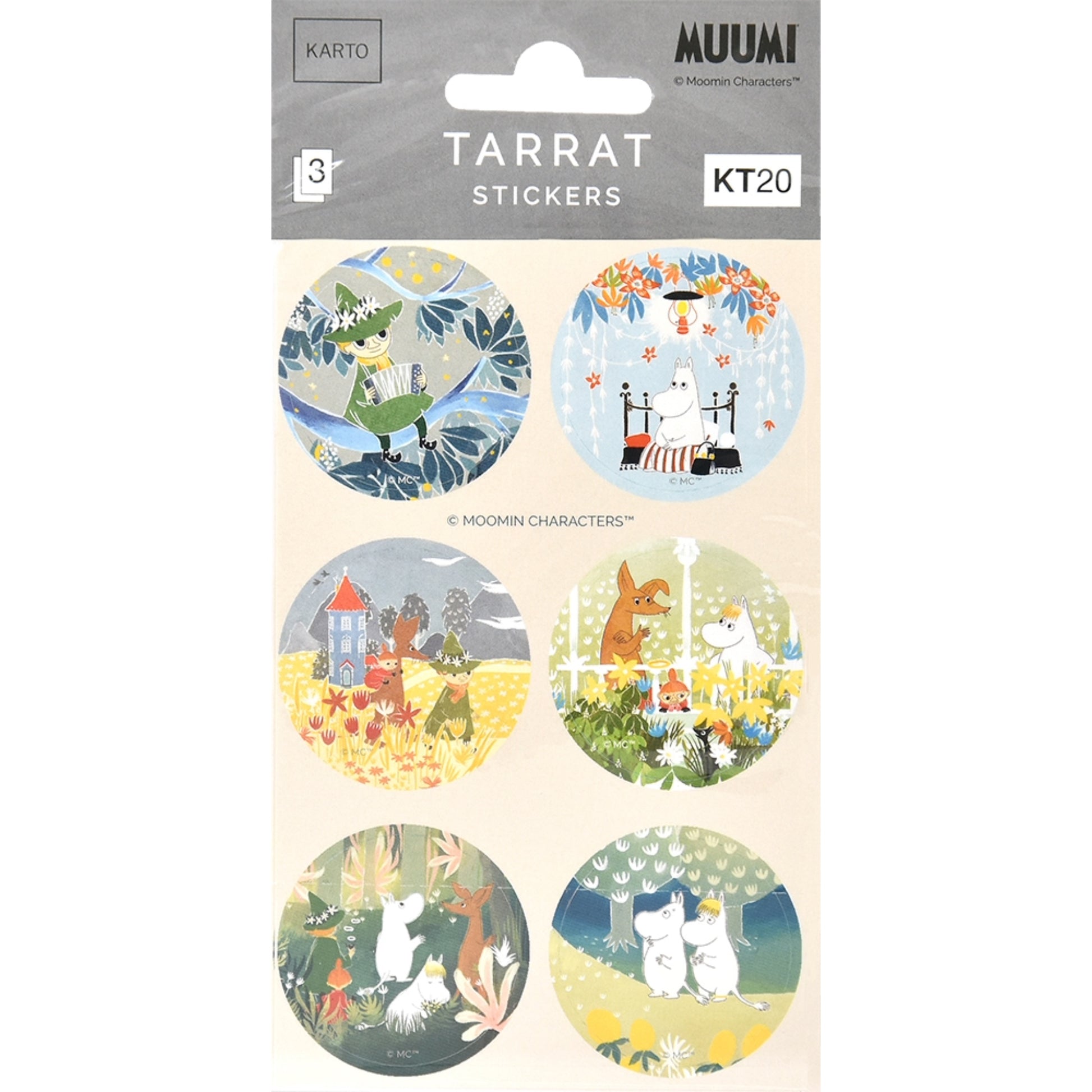 Pakkauksessa kolme levyä Muumi-tarroja.