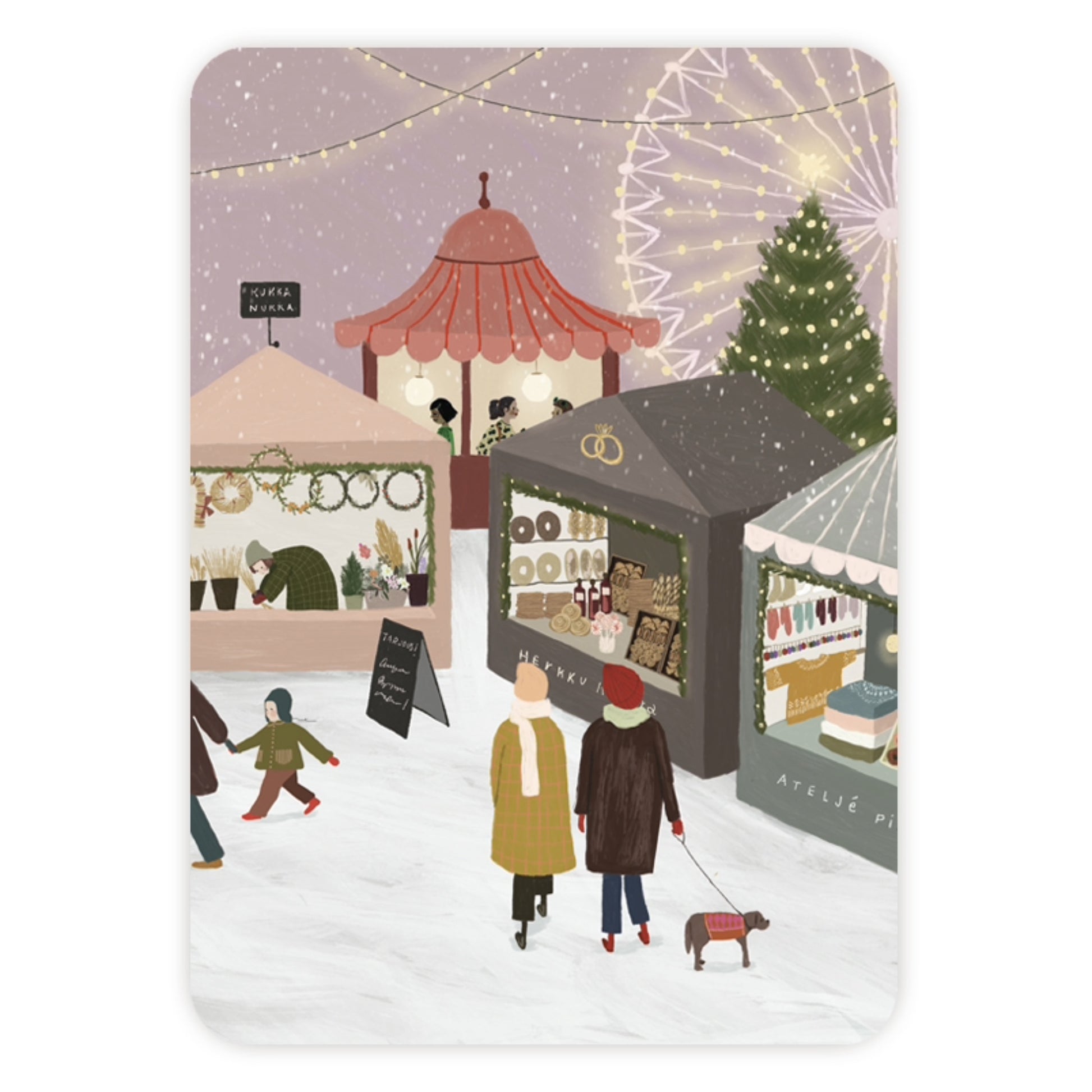 Kotimainen 1-osainen joulukortti laadukasta kartonkia. Kortissa on kuva joulumarkkinoilta, jossa on kojuja, jouluvaloja sekä ihmisiä kuljeskelemassa. Kortissa on pyöristetyt kulmat ja se on tekstitön kääntöpuolelta. Koko 105 x 148 mm. Design: Johanna Ilander.