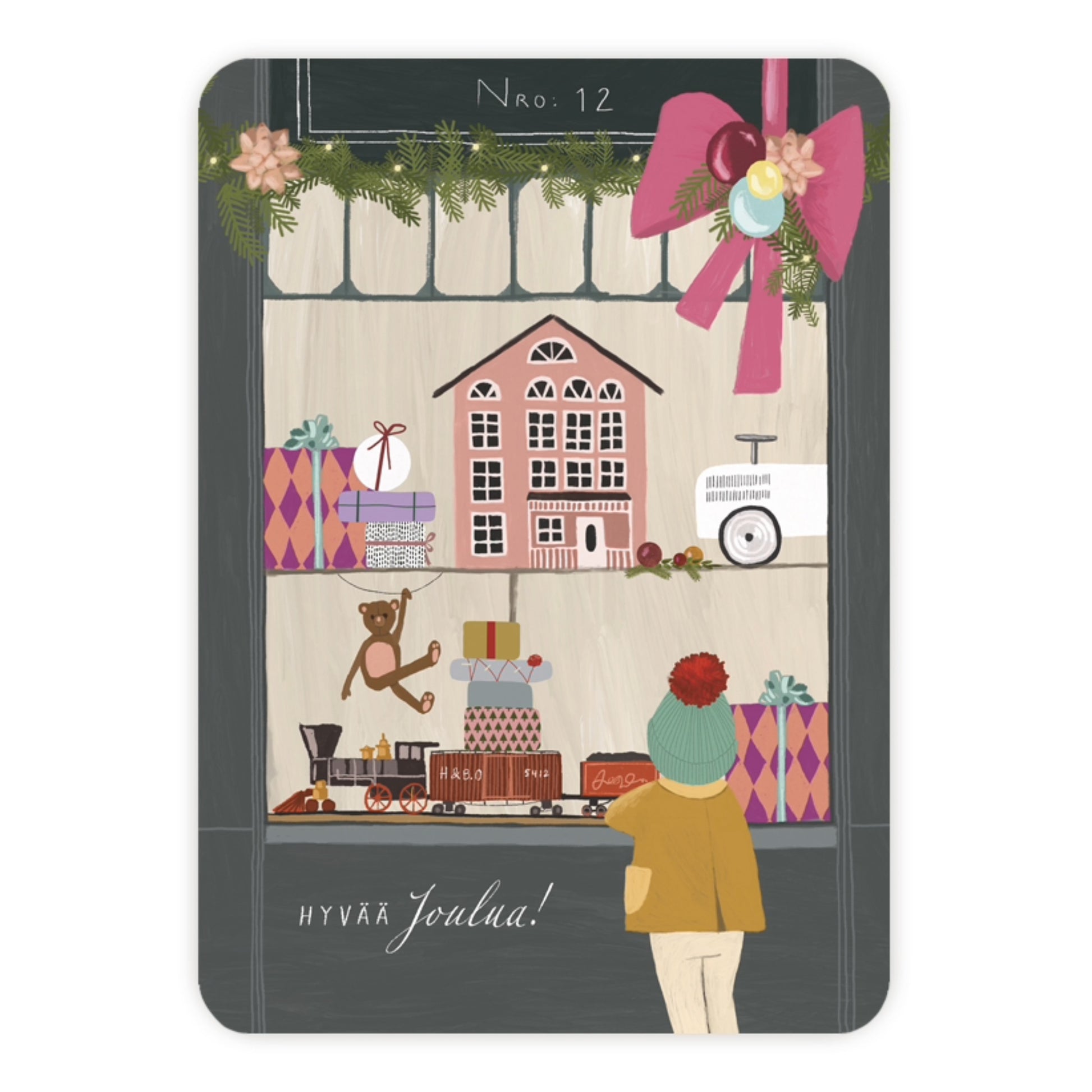 Kotimainen 1-osainen joulukortti laadukasta kartonkia. Kortin kuvassa lapsi katselee joulukaupan näyteikkunaa. Kortissa on teksti "Hyvää joulua!". Kortissa on pyöristetyt kulmat ja se on tekstitön kääntöpuolelta. Koko 105 x 148 mm. Design: Johanna Ilander.