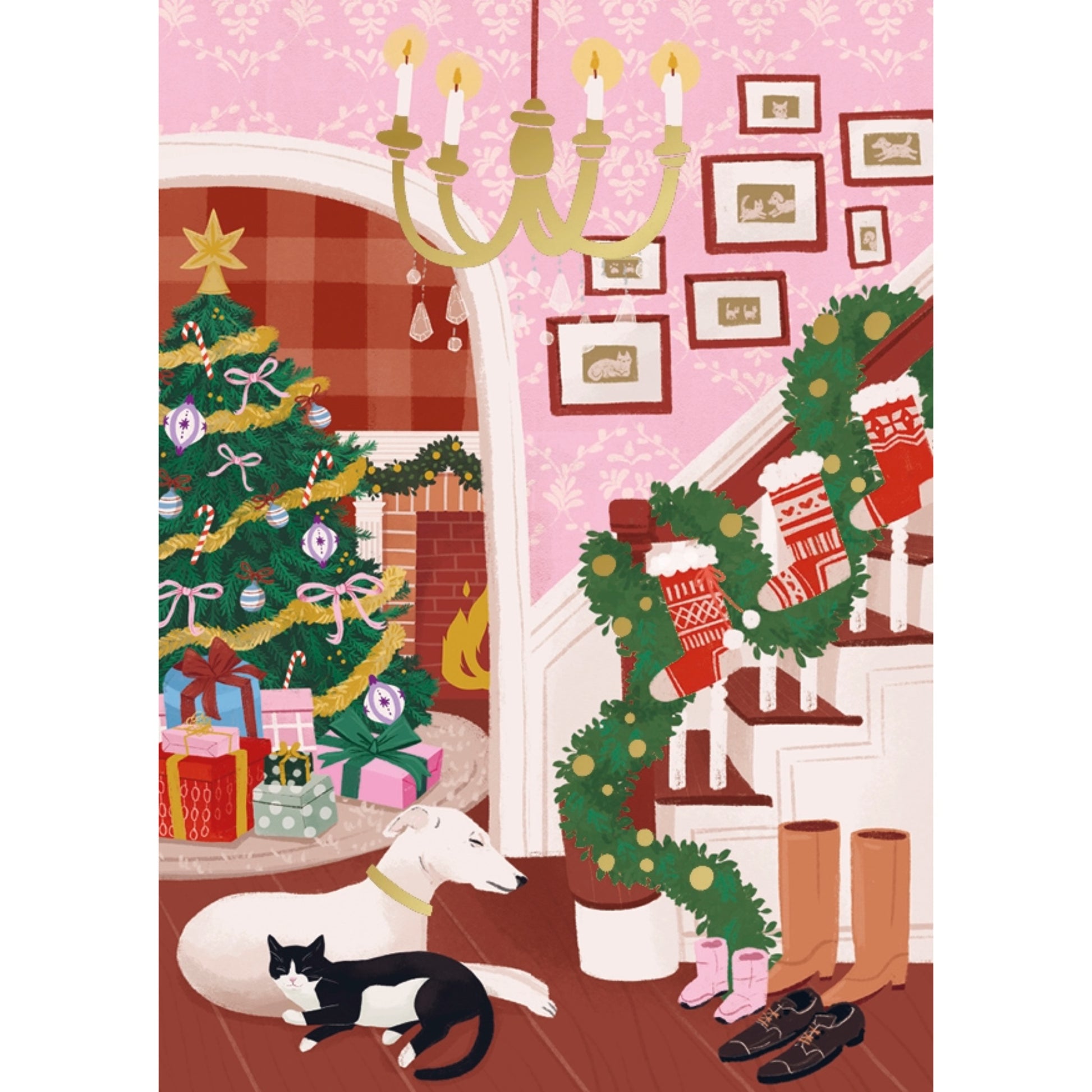 Kotimainen 1-osainen joulukortti laadukasta kartonkia. Kortin kuvassa joulusomisteinen portaikko, lattialla kissa ja koira ja taustalla koristeltu joulukuusi. Kortissa on kultafolioidut yksityiskohdat ja se on tekstitön kääntöpuolelta. Koko 105 x 148 mm. Design: Kaisu Sandberg.