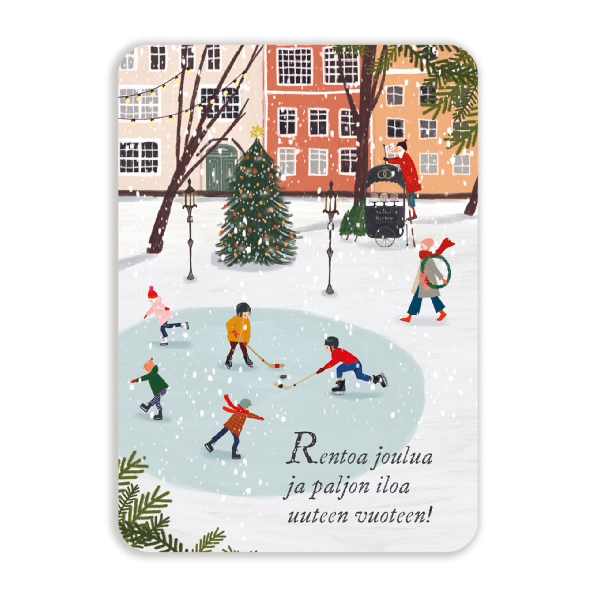 Kotimainen 1-osainen joulukortti laadukasta kartonkia. Kuvassa luistelijoita pienellä kentällä talvisessa kaupunkinäkymässä. Kortissa on teksti "Rentoa joulua ja paljon iloa uuteen vuoteen!". Kortissa on pyöristetyt kulmat ja se on tekstitön kääntöpuolelta. Koko 105 x 148 mm. Design: Johanna Ilander.