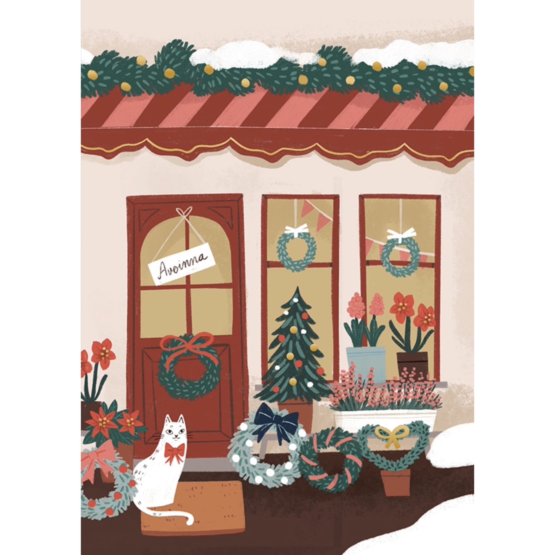 Kotimainen 2-osainen joulukortti laadukasta kartonkia. Kortin kuvassa kukkapuodin julkisivu, joulukoristeluja ja valkoinen kissa. Kortissa on kultafolioidut yksityiskohdat, se on sisältä tekstitön ja sisältää ruskean kirjekuoren. Koko 105 x 148 mm. Design: Kaisu Sandberg.