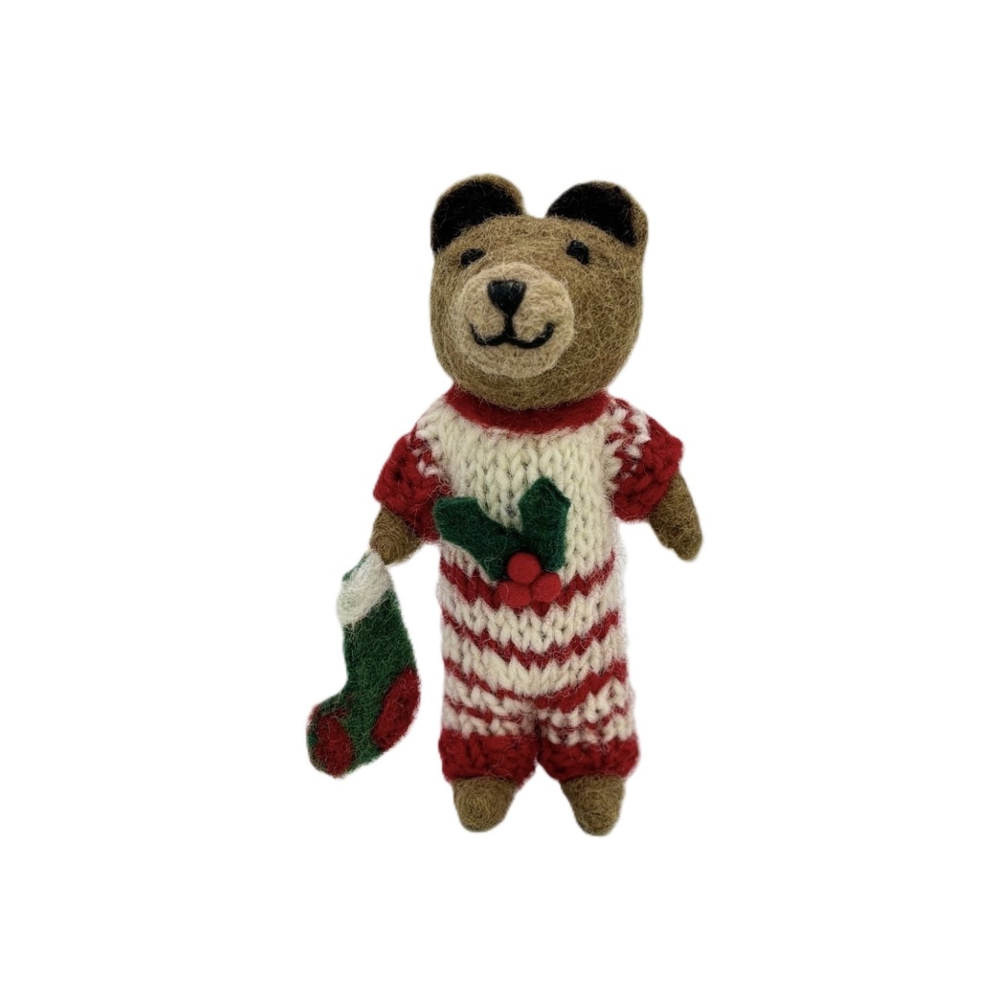 Huopakoriste, jouluaiheinen karhu. Karhulla on punavalkoraidallinen asu yllään ja joulusukka kädessä. Korkeus 12 cm, ripustuslenkki, 100 % villaa. Design: Amica. Valmistettu Nepalissa.