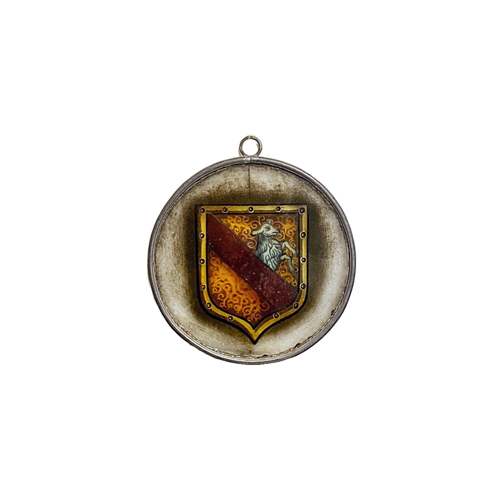 Antiikki lyijylasimaalaus, jossa vaakuna pukin kuvalla. Koko: 10.5cm.